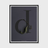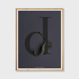 A stylish addition to any plant or nature loving home. This Flora edition letter D poster with its moody dark French navy coloured background and black letter form, combined with a sculptural leaf and dried gumnut leaf would look amazing in a kitchen, living room or bedroom. This is classic design with an earthy touch. An excellent anniversary or housewarming gift. Designed by Belinda Rabe.