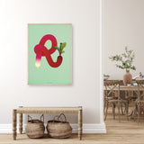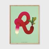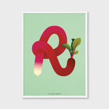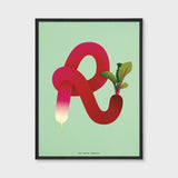 R is for Radish in Georgia Trotter's Extruded food collection. This pop art take on Letter R will brighten up any kitchen. This mint green and deep burgundy red designer artwork would look lovely on any art wall.