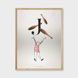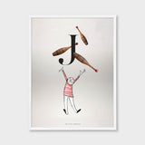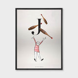 Paul Clark's letter J is part of the Circus Collection of posters. The circus performer in this picture tosses three wooden clubs into the air leaving his hands empty to give the impression that all or nothing is needed to achieve success in life. This illustration artwork and poster design is the perfect whimsical addition to a picture wall, a present to someone who loves to juggle or just a master of juggling life in general.