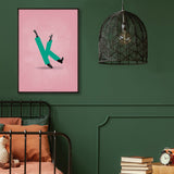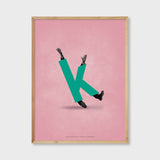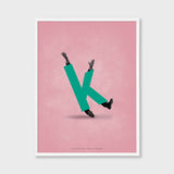 Kevin is a collage of the K letterform with arms and legs akimbo. Kevin, in his pink setting and and teal green attire, was created by Tim Kliendienst and is part of the Collection of Characters. This is the perfect addition to any picture wall or kids' bedroom.